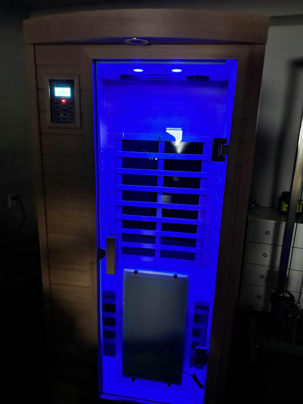 It's important to note that the sauna also includes an infrared heating panel on the front door glass, as well as heating panels located on the sides for the calves and the soles of the feet, resulting in a complete 360-degree wrap-around infrared heating experience.