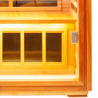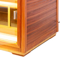 Our Garner-901VS infrared saunas are crafted from premium American Fir wood. Fir wood is an excellent option for outdoor furniture items like picnic tables, ottomans, and chairs. Fir is a type of softwood but relatively strong and durable. And Fir is lighter in color with small tight knots that give its rustic appearance. It is known for its stability and resistance to decay, making it a popular choice for outdoor construction projects. When used in saunas, fir provides a warm and inviting aesthetic.