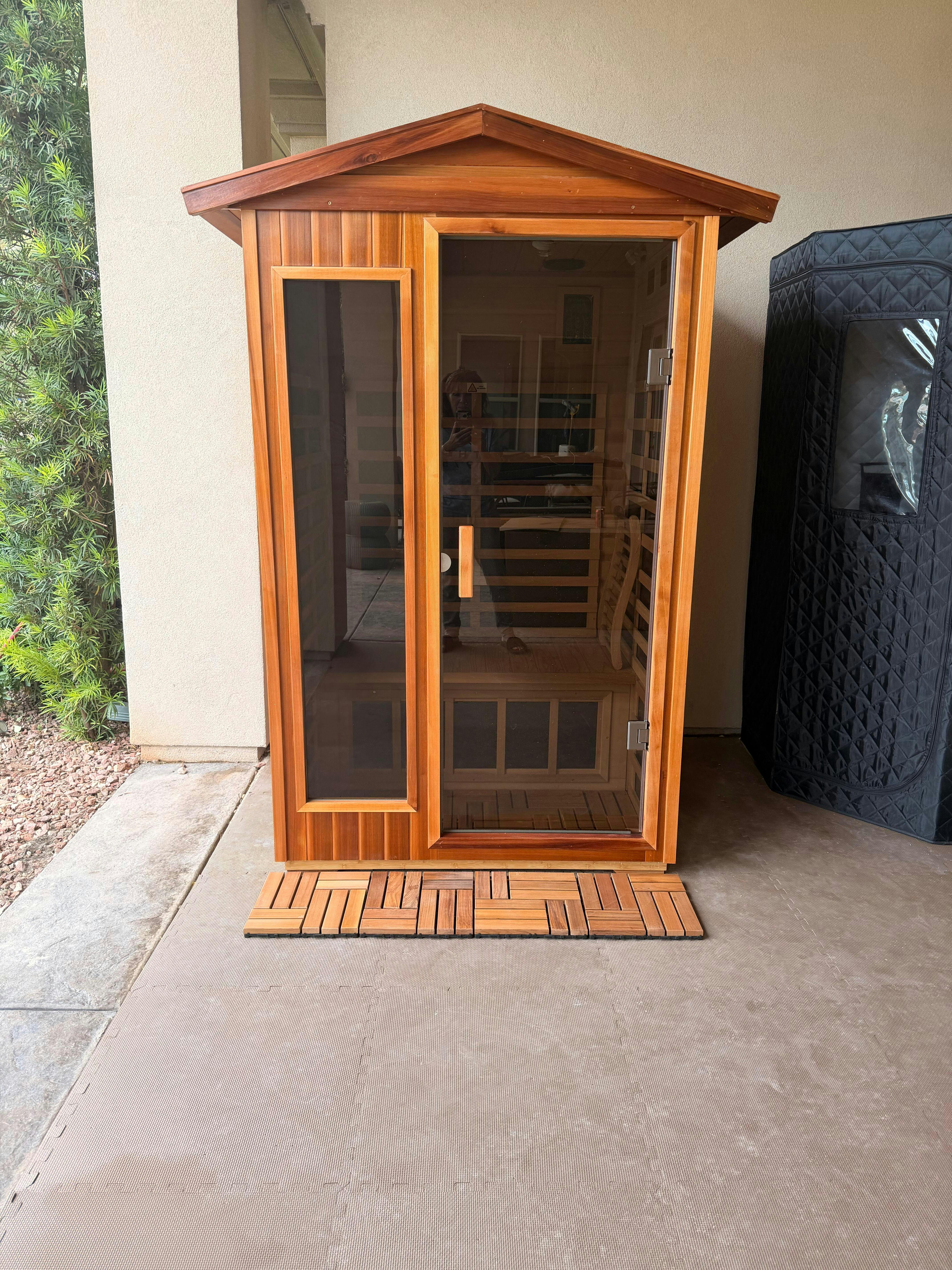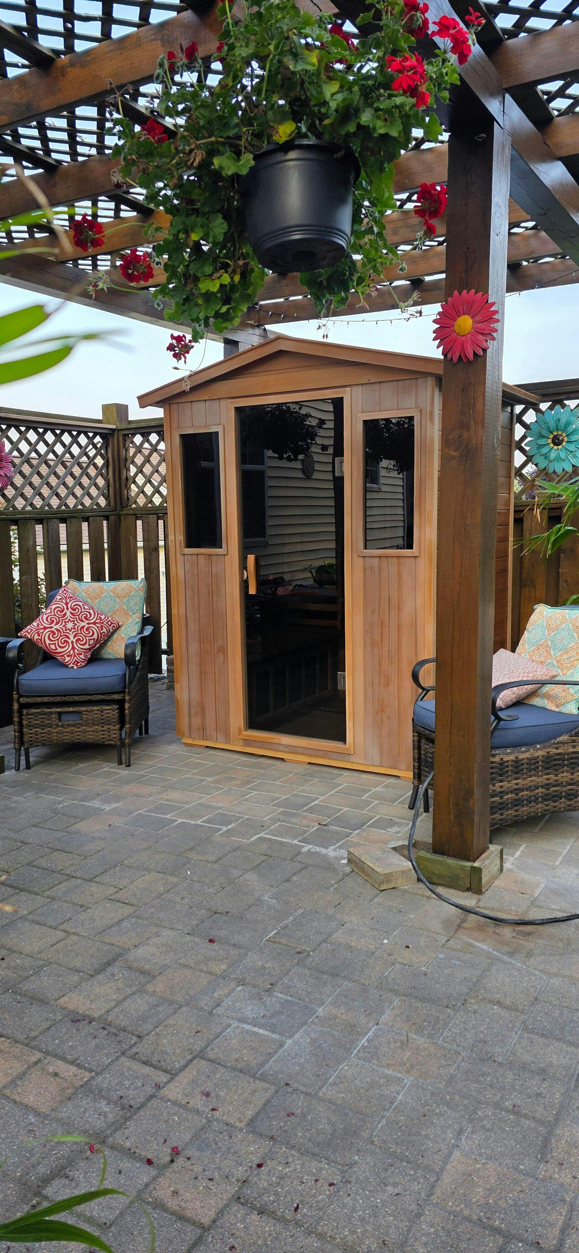 I had a hot tub that died and indecided to replace it with an infrared sauna. This has been such a good decision. I had set and leveled pavers before the unit arrived and assembly was super easy. It took longer to unbox the well packaged sauna. I bought the finger bot from Amazon at the recommendation of the staff at Salusheat and it works great to remotely start the sauna. It takes about 30 min to get to my desired temp of 135. The sauna smells so good inside and the speakers are easy to connect to.