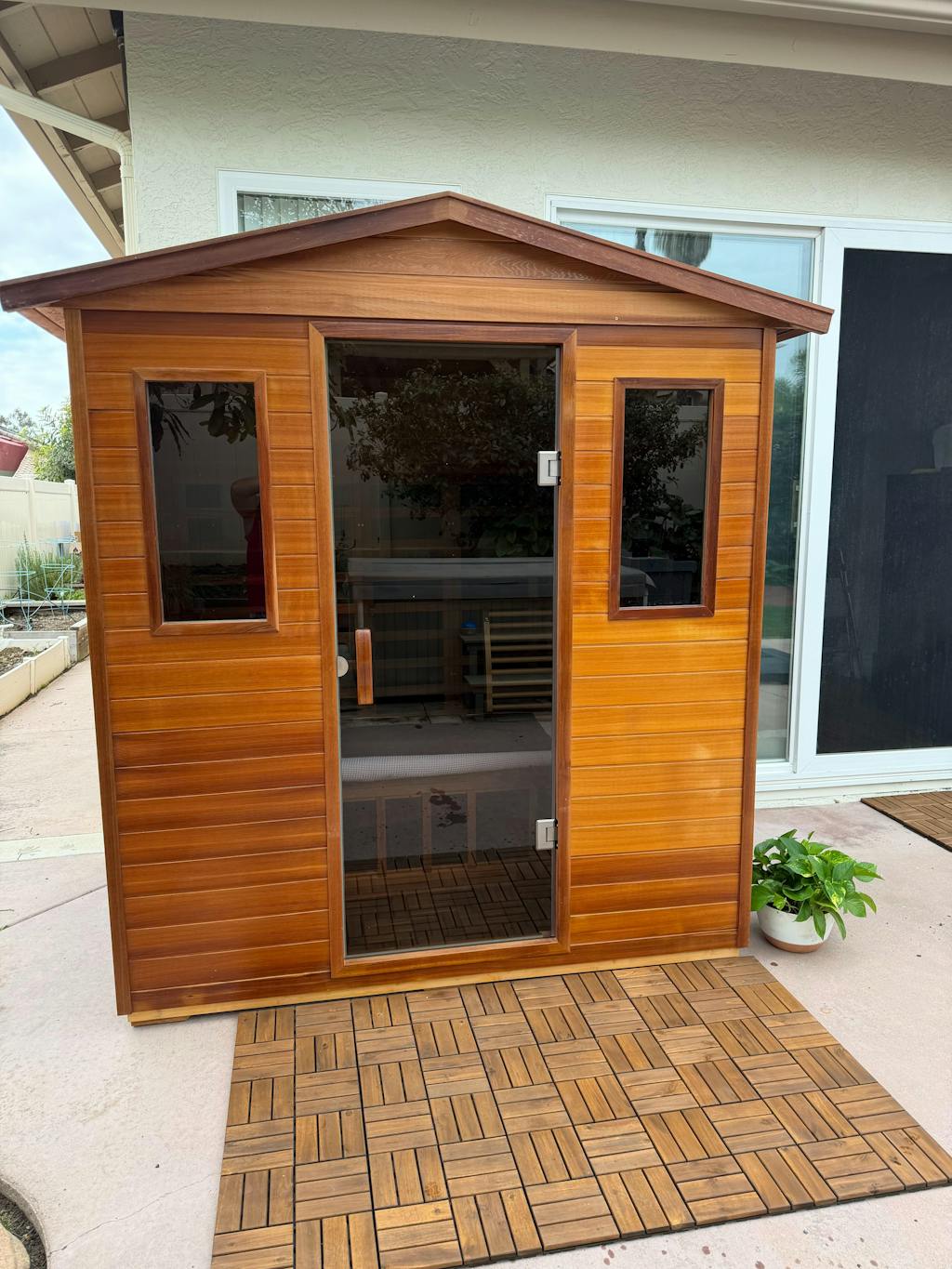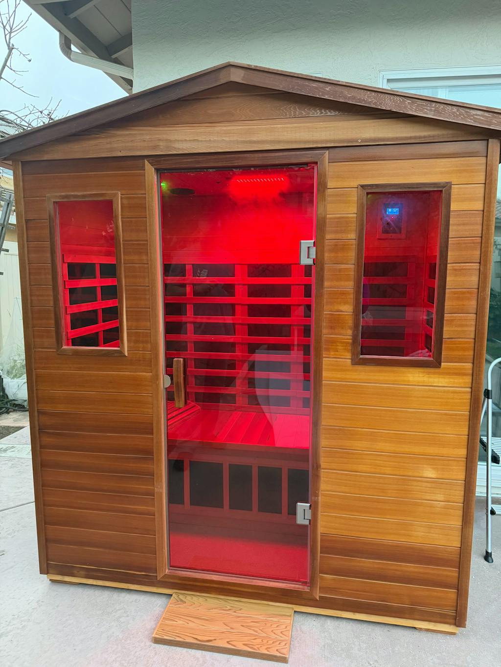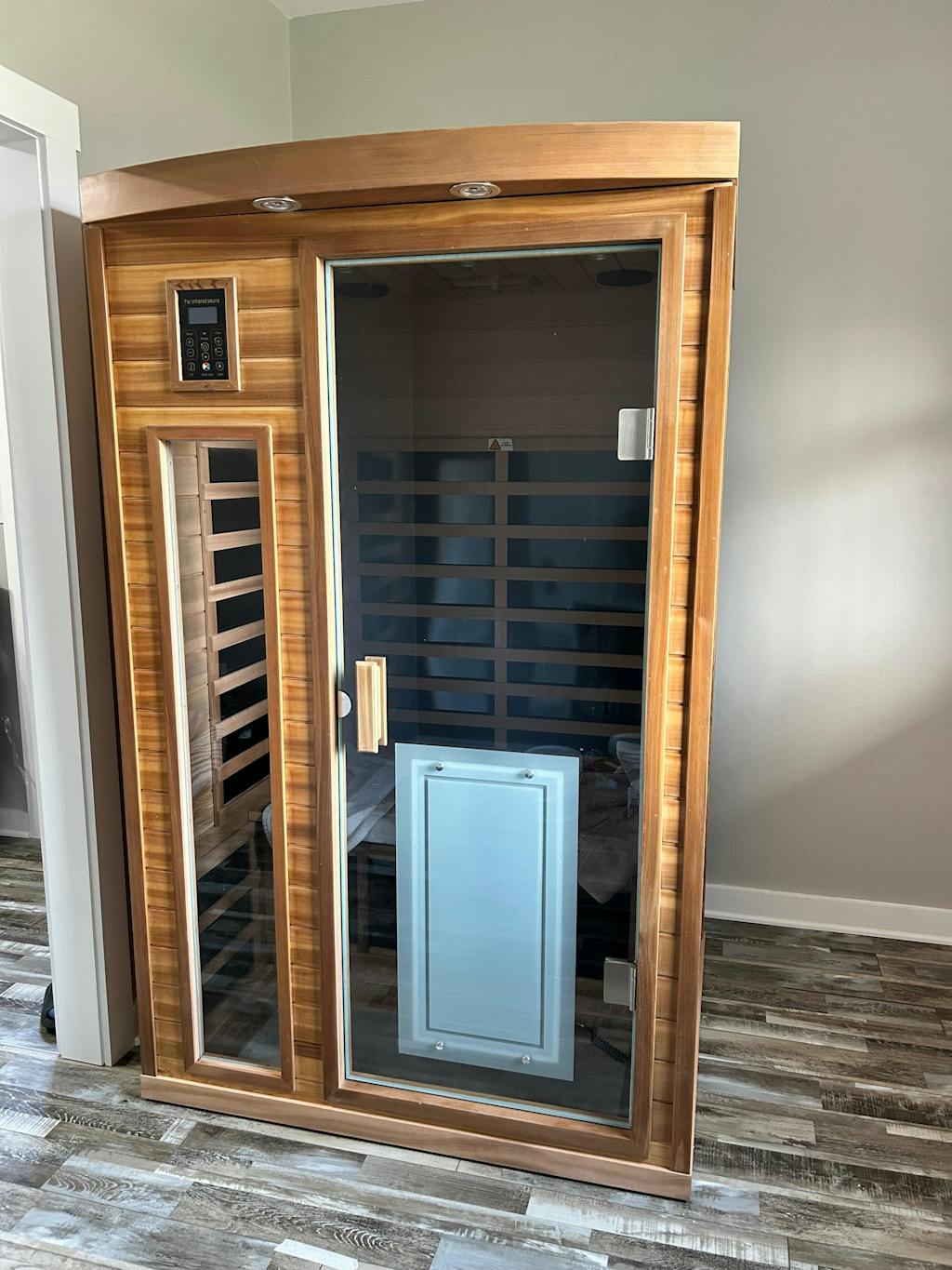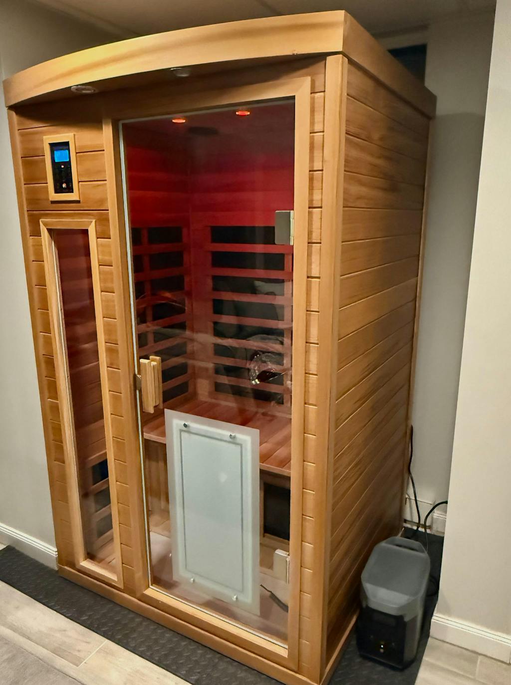 We love our Sublime sauna red cedar wood sauna! We were concerned about space and size, but this is compact enough to easily fit in our garage - while still leaving enough space to sit comfortably in the sauna. I’m 5’10”, 210lbs and I fit in here without any issues. The Bluetooth speakers are super easy to use. Sauna heats up to 140 in 15 minutes. I basically assembled the sauna myself, while the wife helped when installing the glass door. Total time on assembly was under 30 minutes. I recommend these to everyone. Pricing is great for the product. The only thing we’re upset about, is we didn’t know about this sooner! The wife and I each used this at least 4-5 times a week. You really get a great sweat. 5/5 stars. Would give 10 if I could! Do yourself the favor, and order one, you will not regret it.