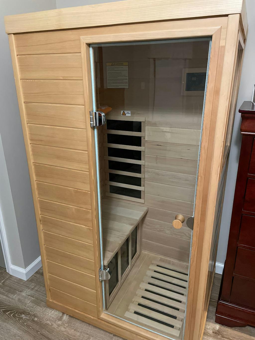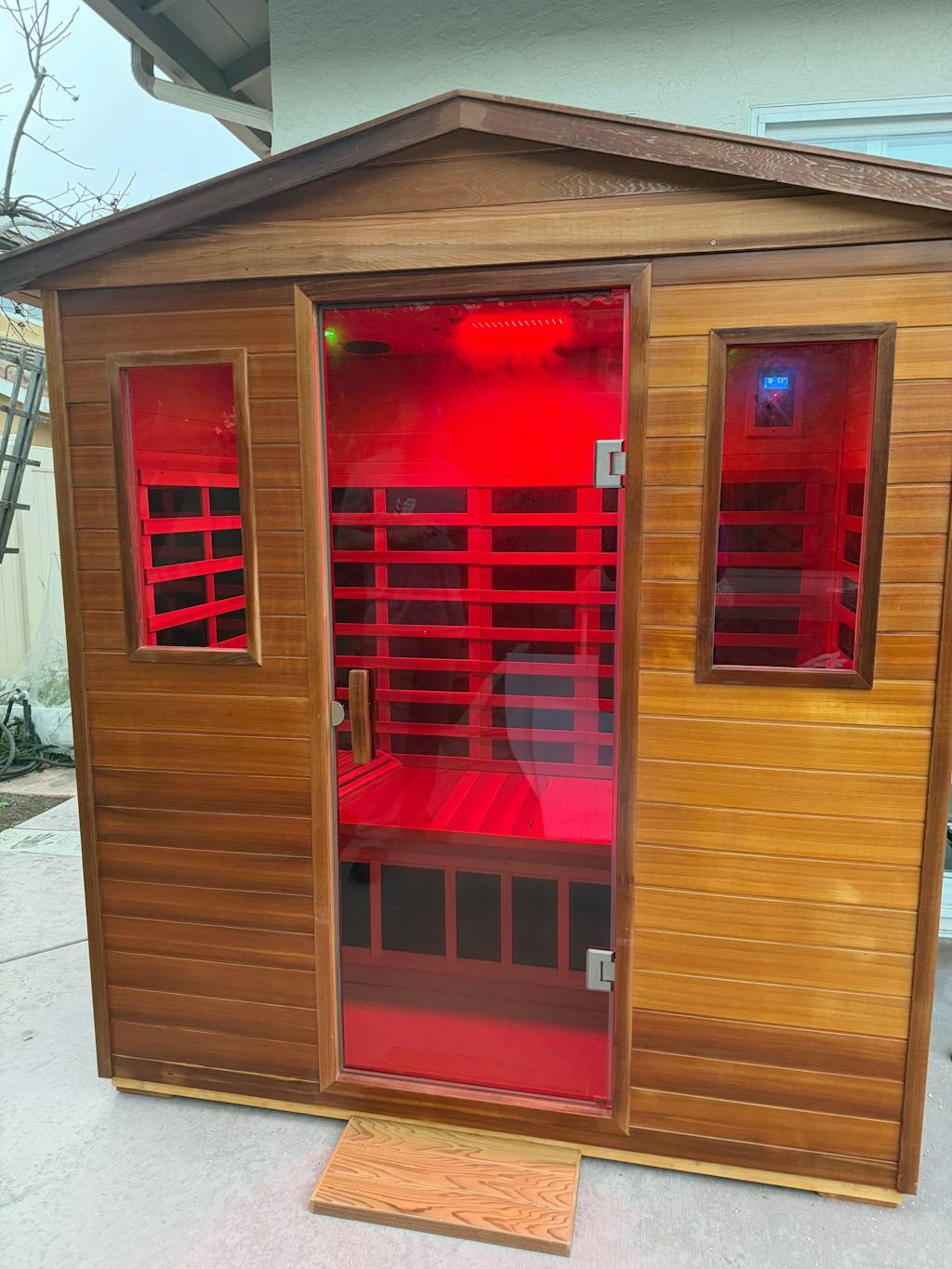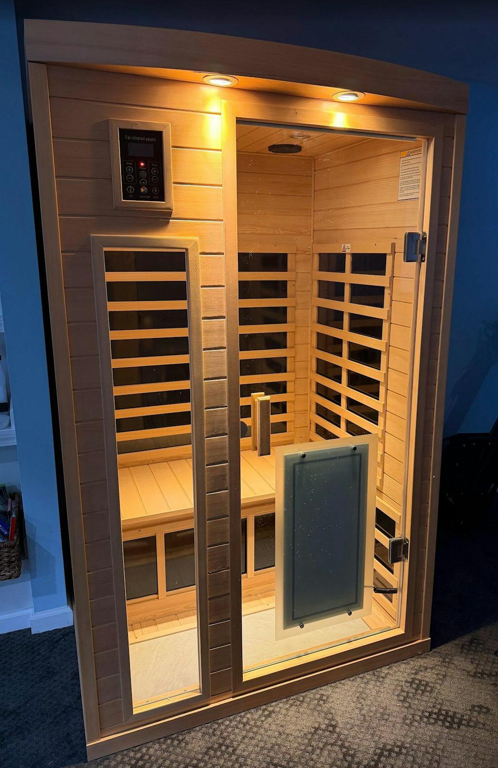 We love our Sublime sauna red cedar wood sauna! We were concerned about space and size, but this is compact enough to easily fit in our garage - while still leaving enough space to sit comfortably in the sauna. I’m 5’10”, 210lbs and I fit in here without any issues. The Bluetooth speakers are super easy to use. Sauna heats up to 140 in 15 minutes. I basically assembled the sauna myself, while the wife helped when installing the glass door. Total time on assembly was under 30 minutes. I recommend these to everyone. Pricing is great for the product. The only thing we’re upset about, is we didn’t know about this sooner! The wife and I each used this at least 4-5 times a week. You really get a great sweat. 5/5 stars. Would give 10 if I could! Do yourself the favor, and order one, you will not regret it.