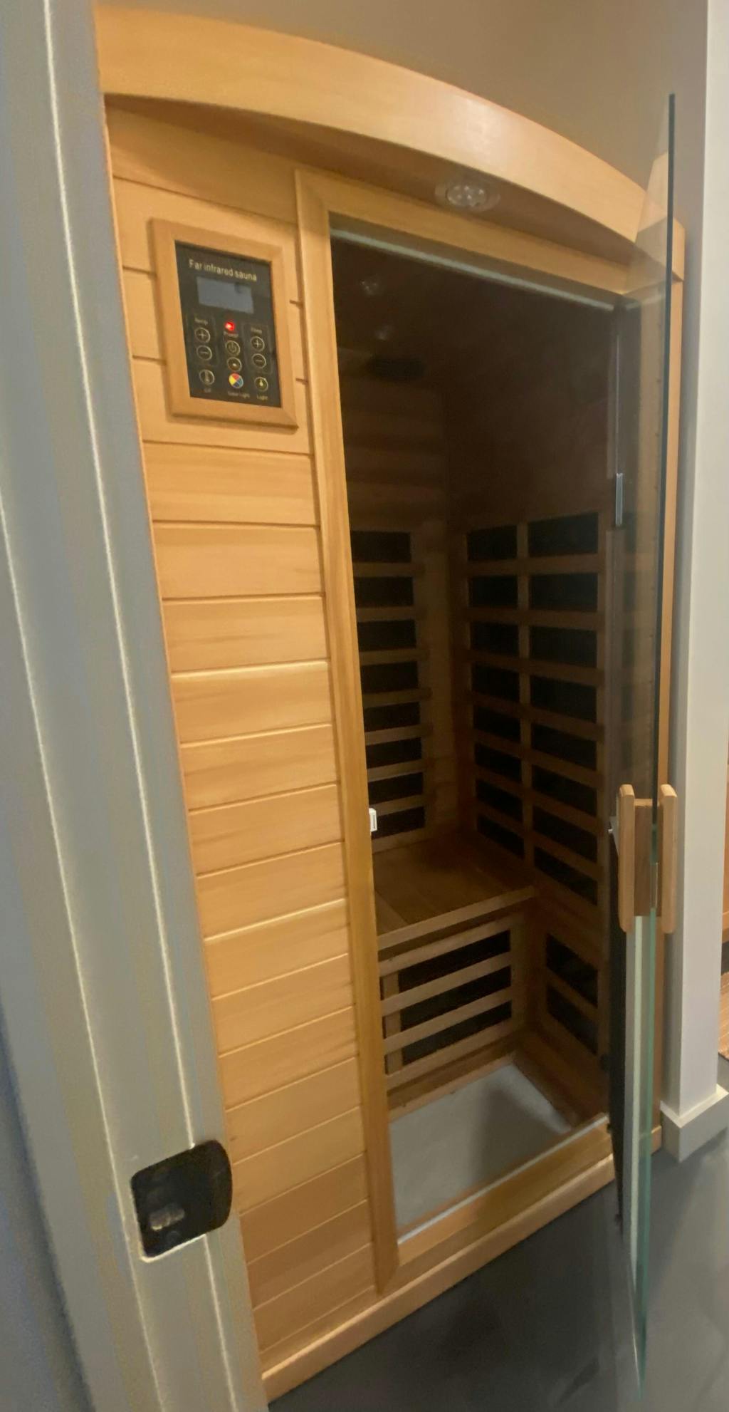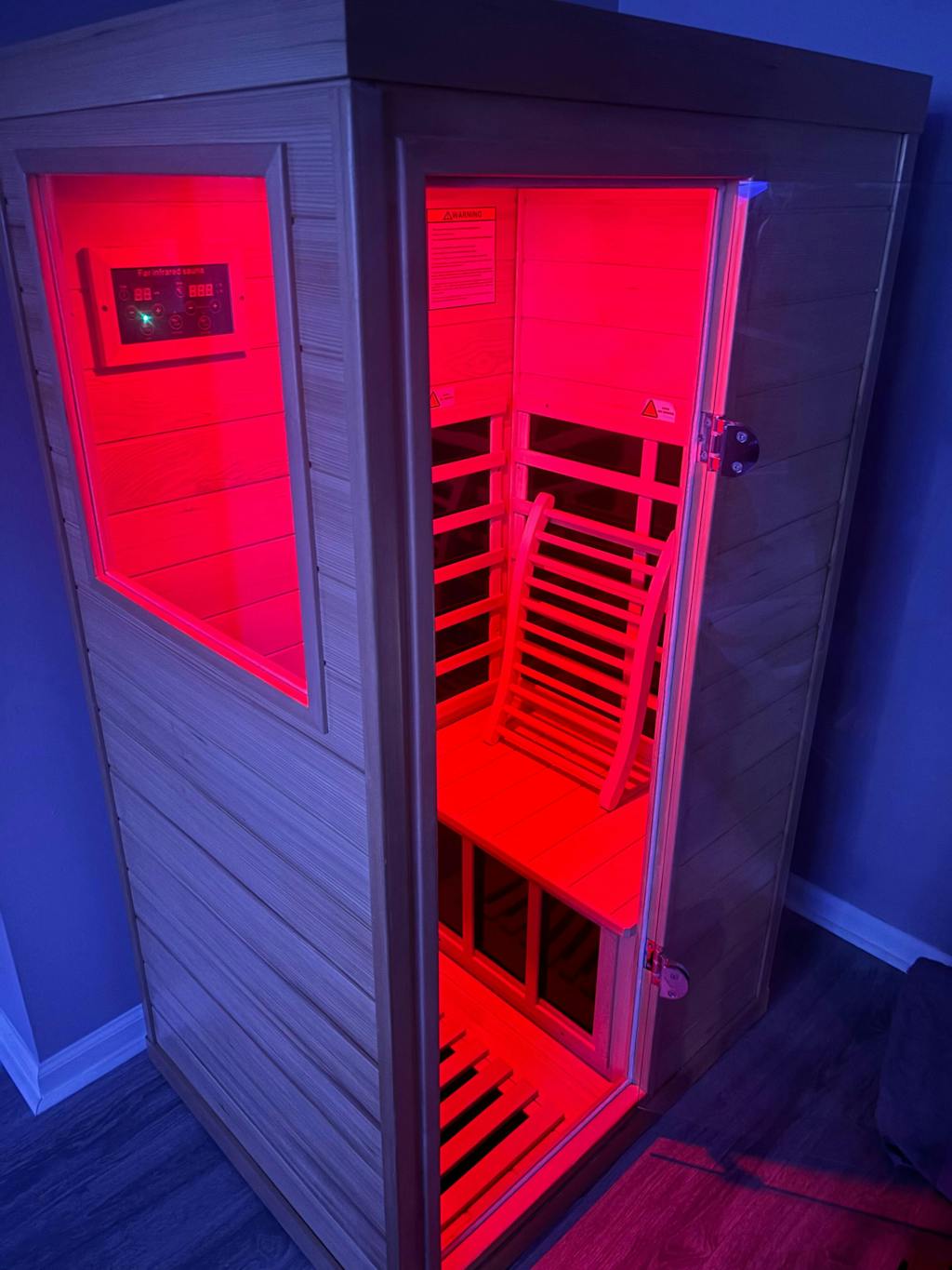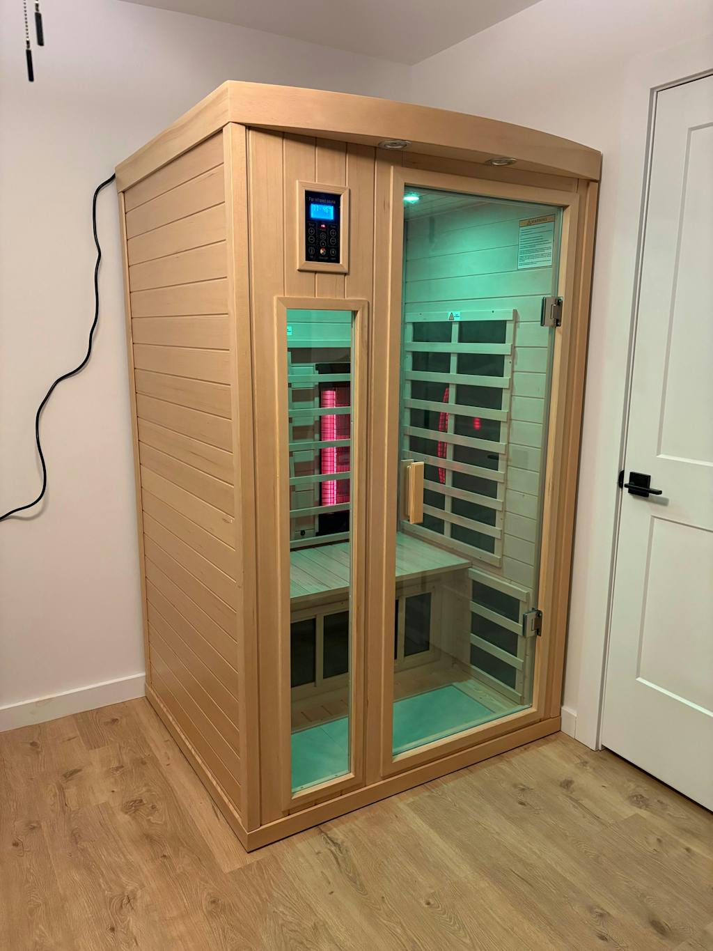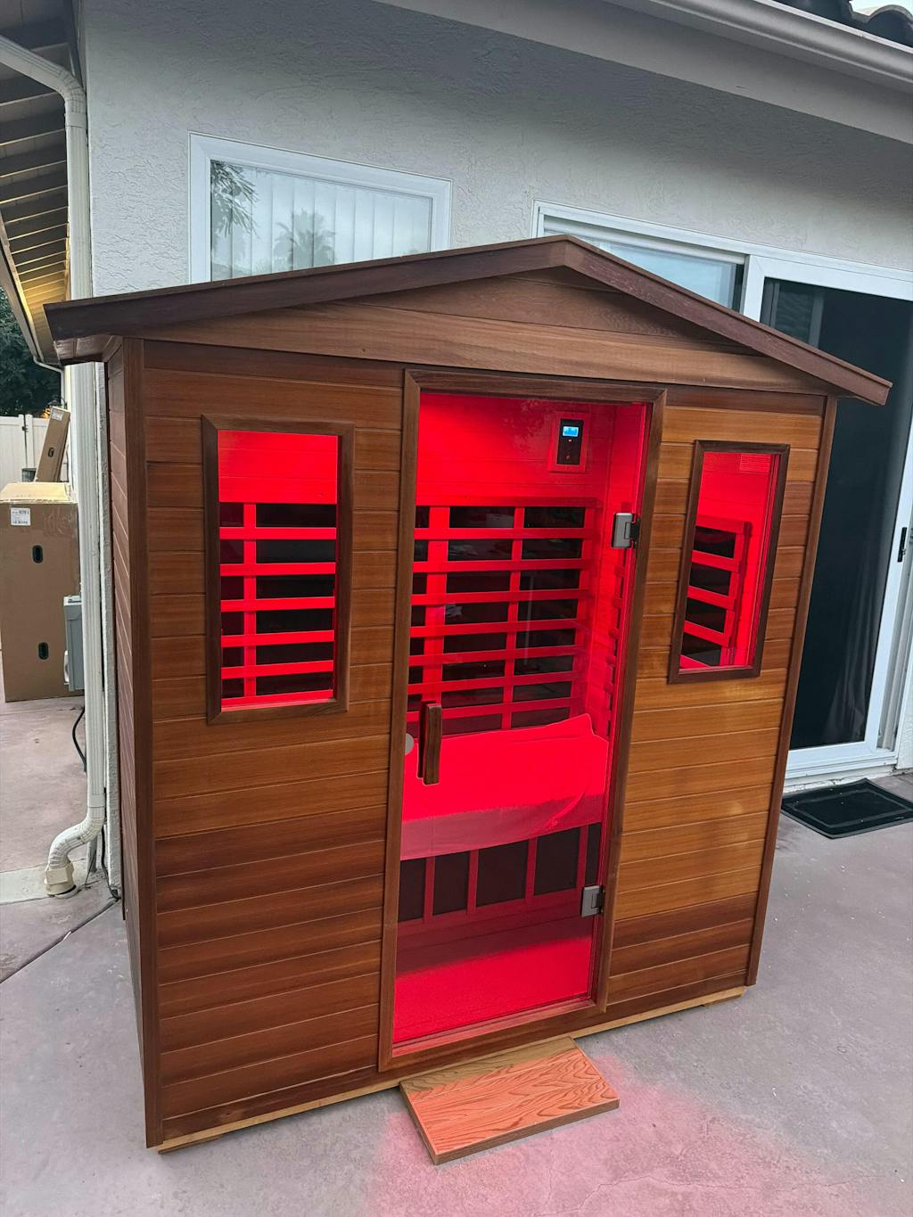 We love our Sublime sauna red cedar wood sauna! We were concerned about space and size, but this is compact enough to easily fit in our garage - while still leaving enough space to sit comfortably in the sauna. I’m 5’10”, 210lbs and I fit in here without any issues. The Bluetooth speakers are super easy to use. Sauna heats up to 140 in 15 minutes. I basically assembled the sauna myself, while the wife helped when installing the glass door. Total time on assembly was under 30 minutes. I recommend these to everyone. Pricing is great for the product. The only thing we’re upset about, is we didn’t know about this sooner! The wife and I each used this at least 4-5 times a week. You really get a great sweat. 5/5 stars. Would give 10 if I could! Do yourself the favor, and order one, you will not regret it.