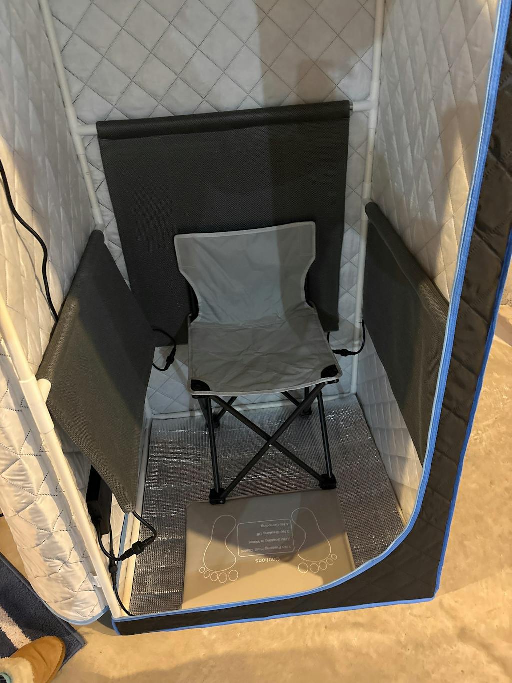 This sauna was easy to set up, following the instructions that were sent in the box. It doesn’t feel tight for one person, and the heat level is just right. The chair is comfortable. I set the timer for 30 minutes, and then get in when there is 20 minutes left for optimal heat. You won’t be disappointed with this unit.