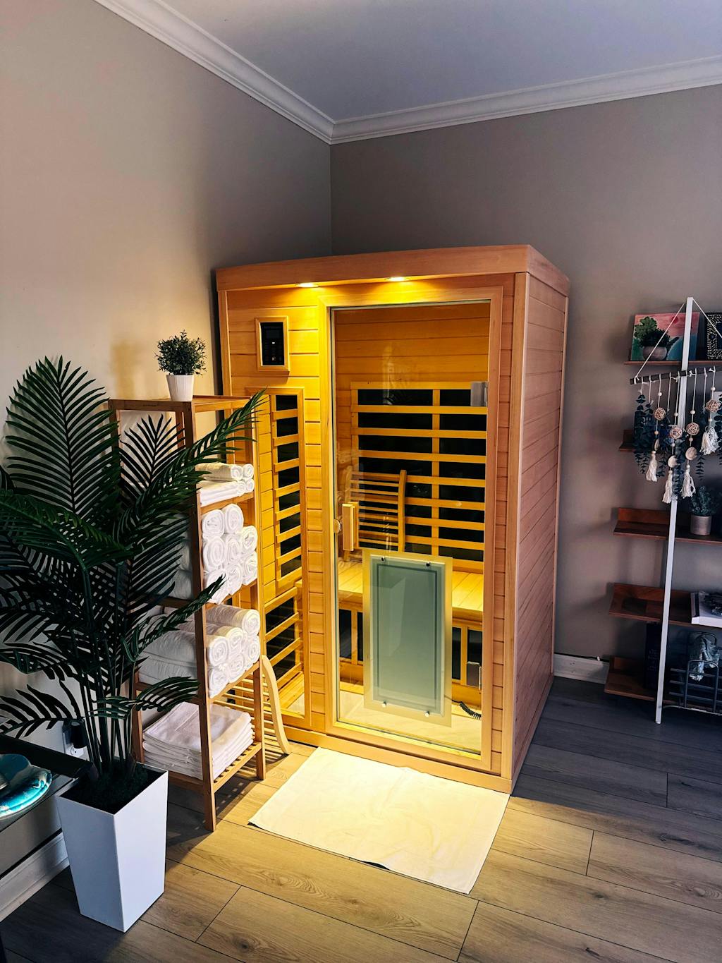 It's important to note that the sauna also includes an infrared heating panel on the front door glass, as well as heating panels located on the sides for the calves and the soles of the feet, resulting in a complete 360-degree wrap-around infrared heating experience.