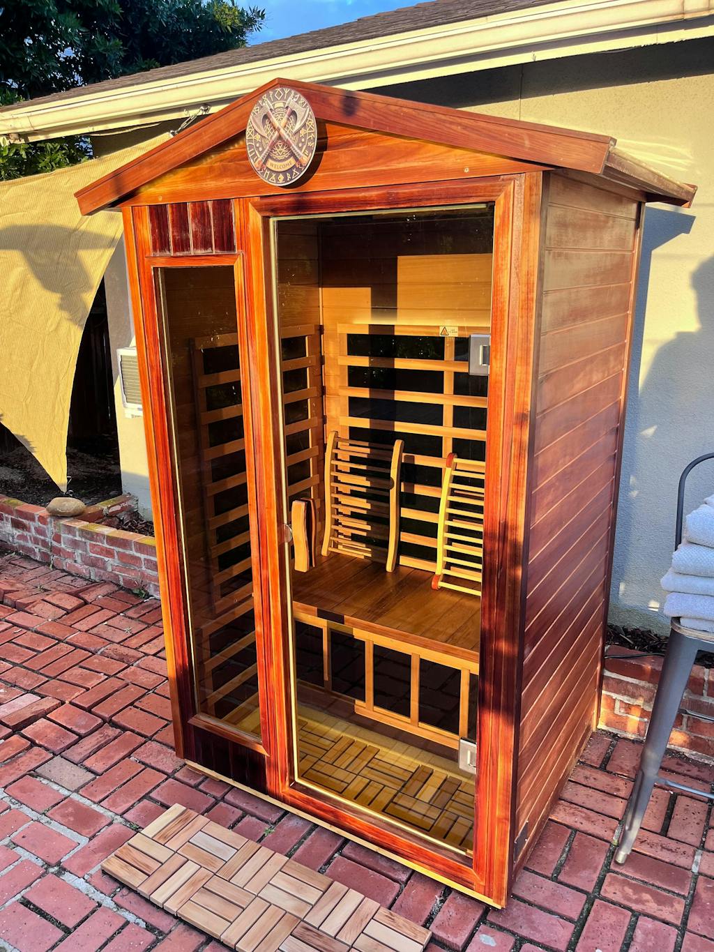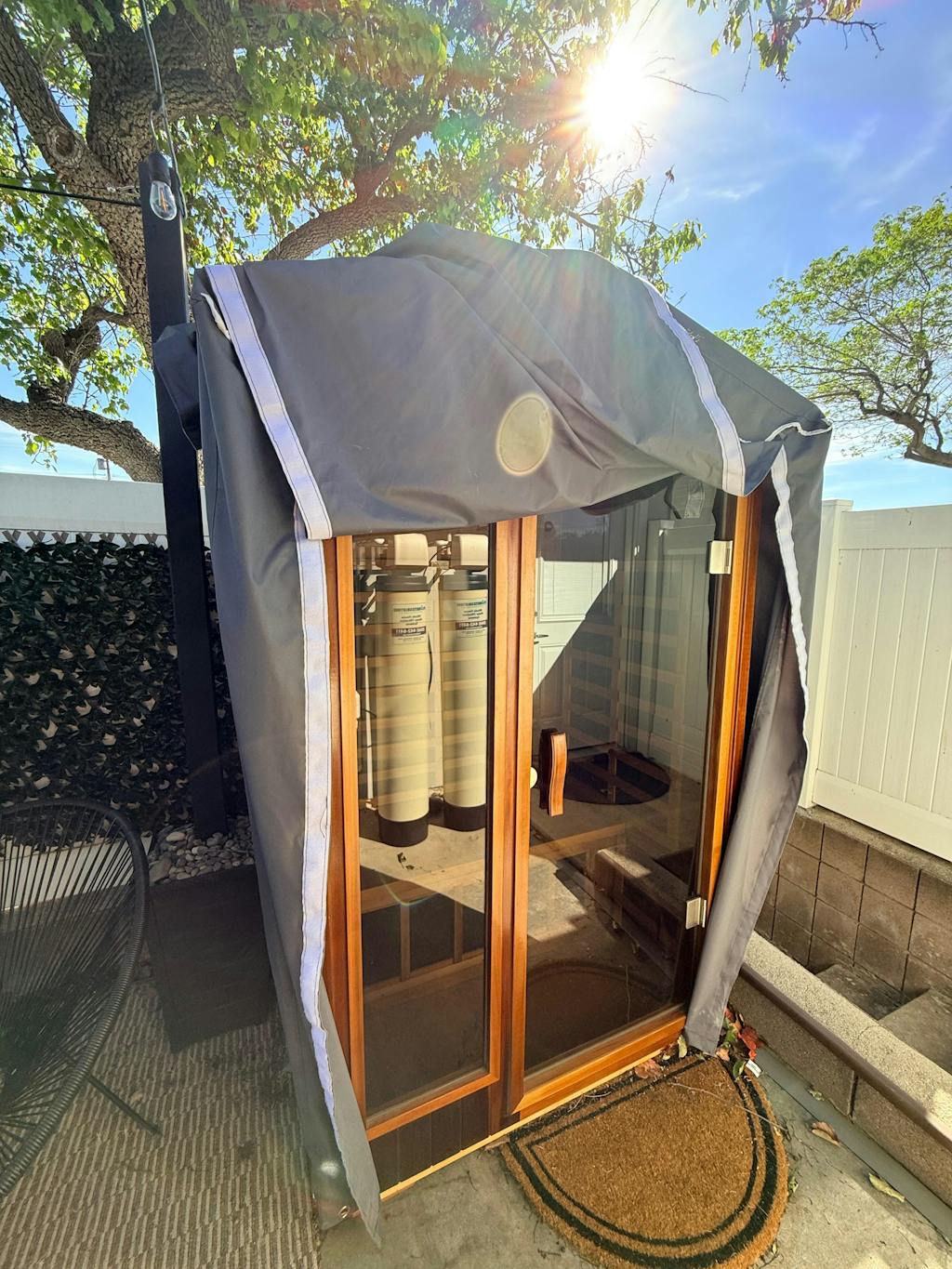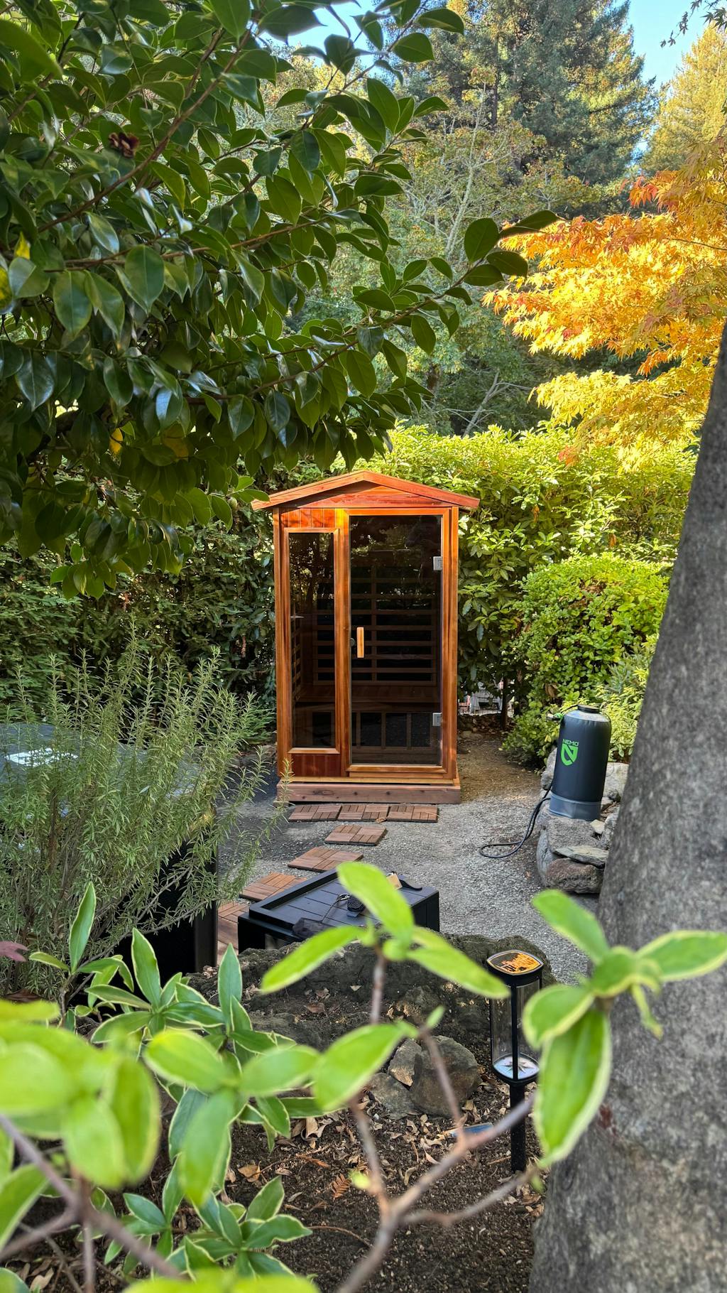 The Wearwell-902VR as an outdoor sauna that can still be connected to a standard household outlet. No wiring is required!